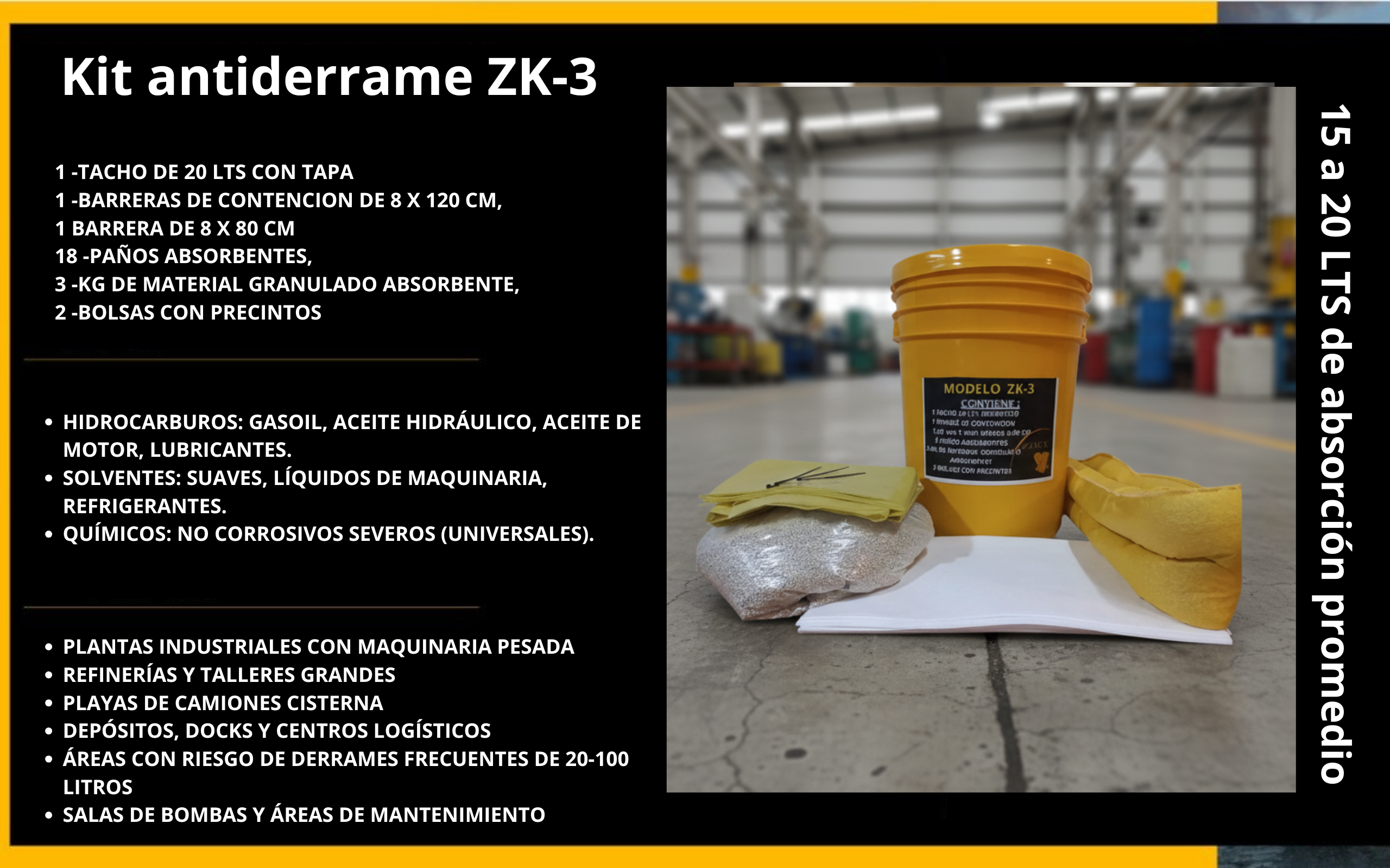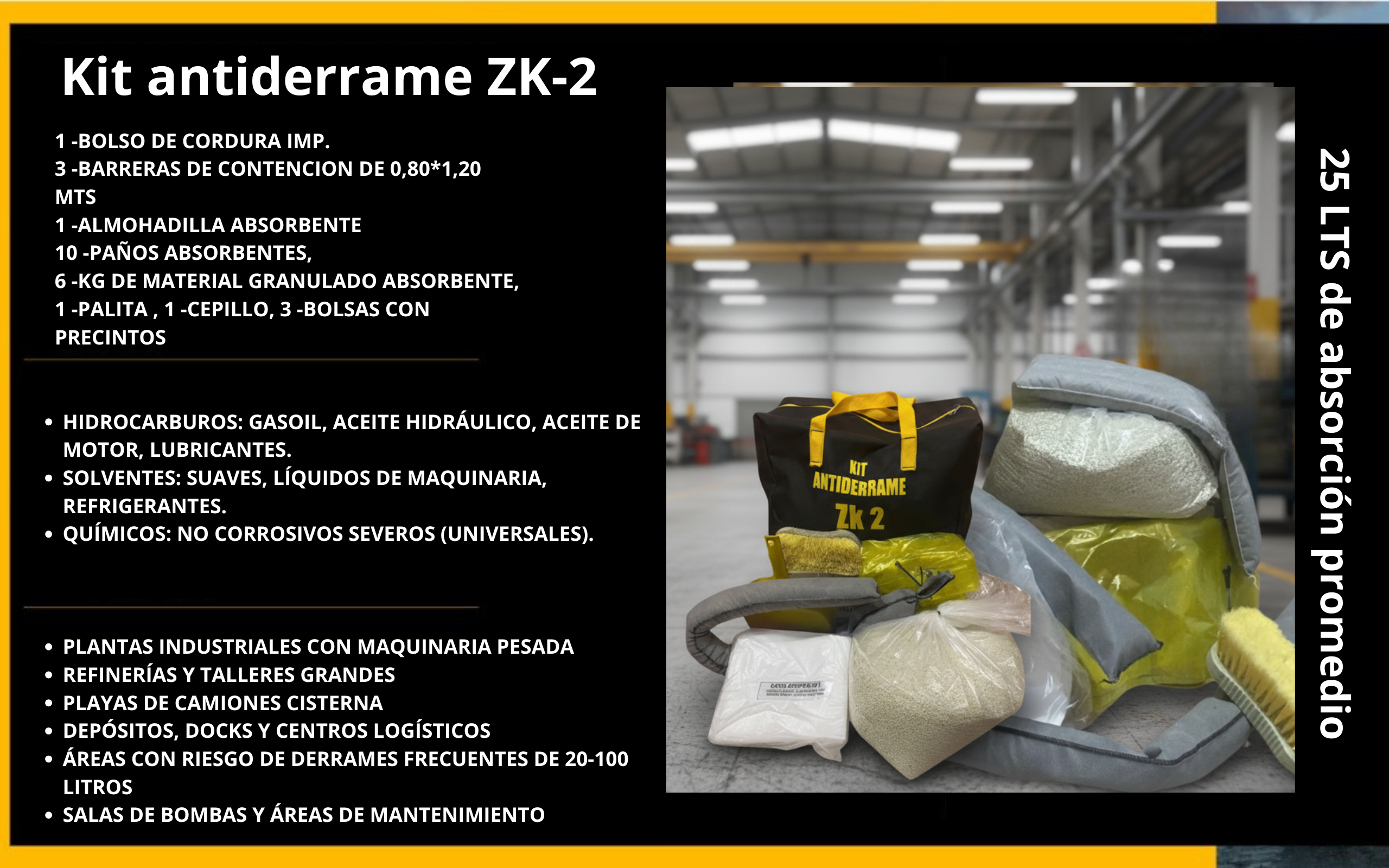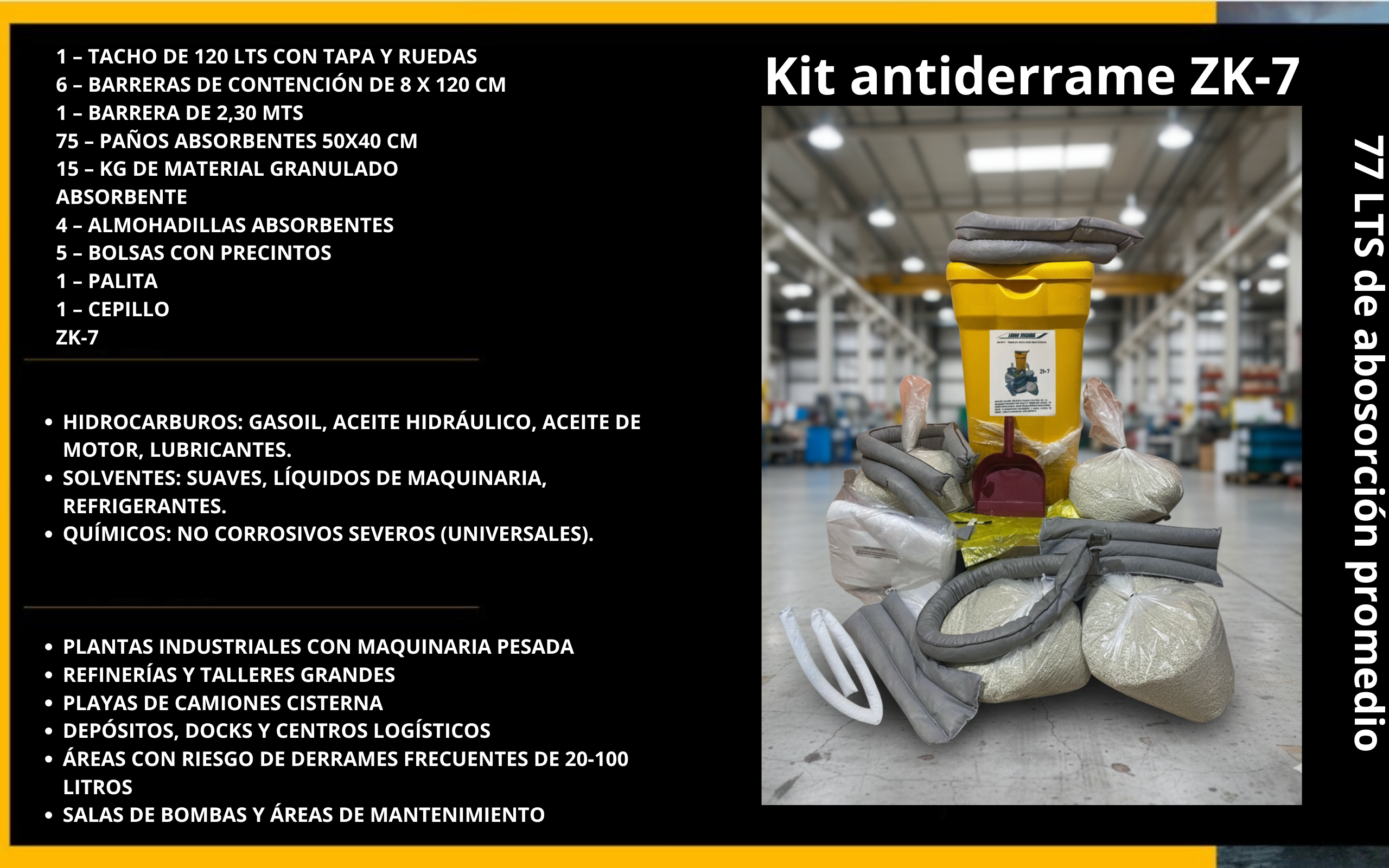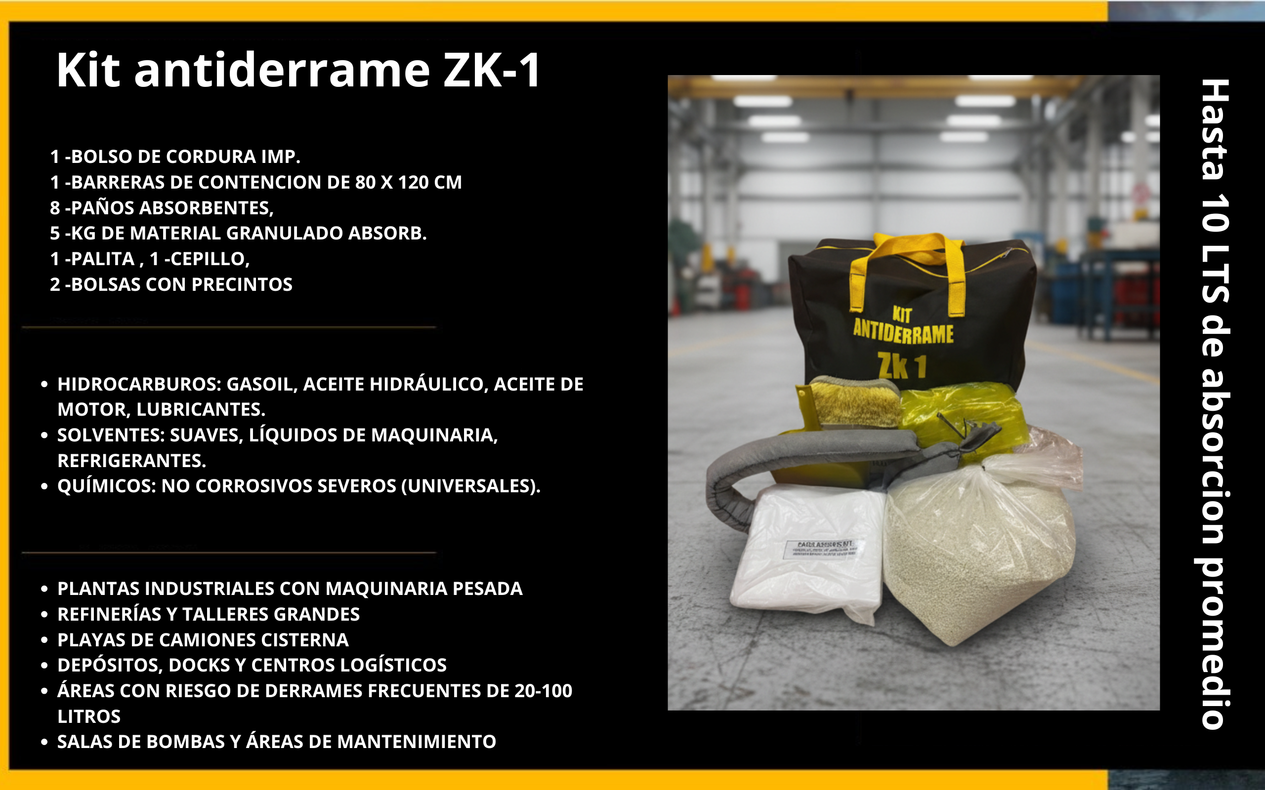 Somos los fabricantes N.º 1 de kits antiderrames en Argentina, con más de una década de experiencia en la seguridad industrial. Nuestra línea de productos incluye los modelos más demandados del mercado: Kit Antiderrame ZK-1, Kit Antiderrame ZK-2 y Kit Antiderrame ZK-7, diseñados para garantizar máxima absorción, contención inmediata y cumplimiento normativo.